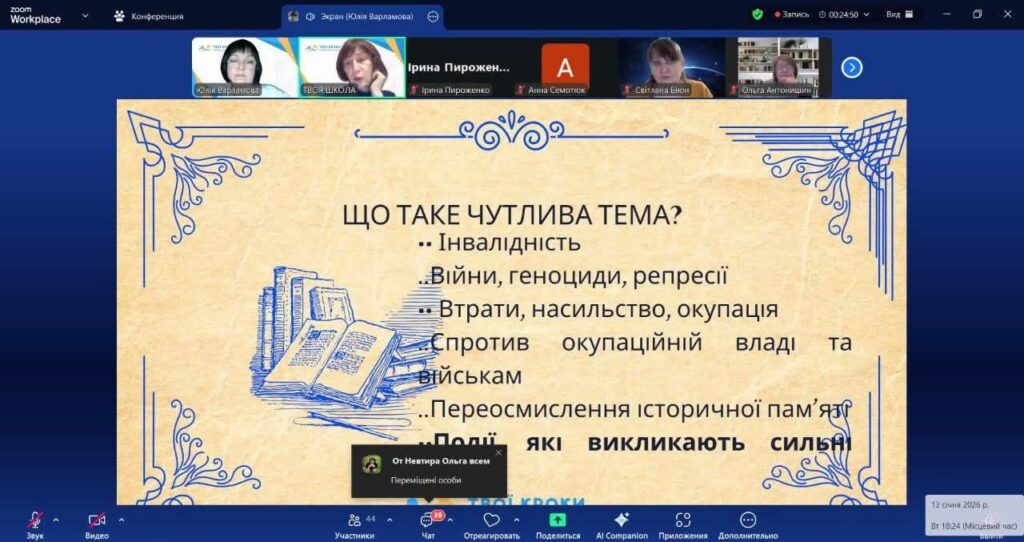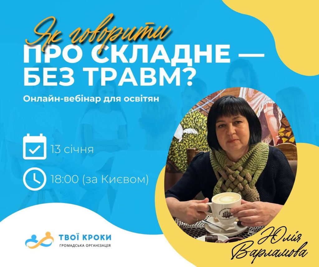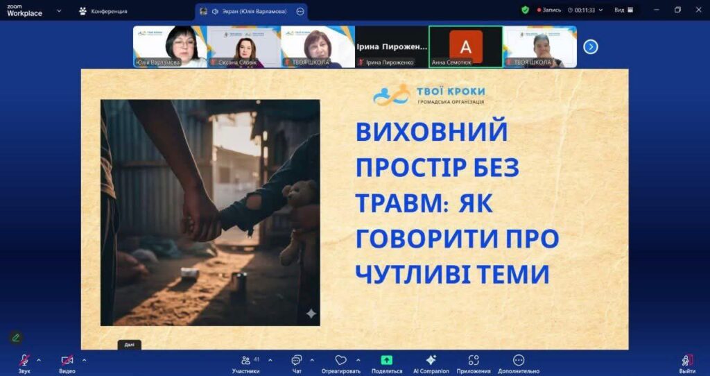 -У сучасних умовах школа дедалі частіше стикається з необхідністю говорити з учнями про складні та болючі сторінки історії, – розповіла Юлія Володимирівна.Такі теми вимагають особливої делікатності, адже неправильно вибудувана виховна година може викликати тривогу, страх або ретравматизацію. Тому на запрошення ГО «Твої кроки» провела вебінар для вчительства України на тему «Виховний простір без травм: як говорити з учнівством на чутливі теми».