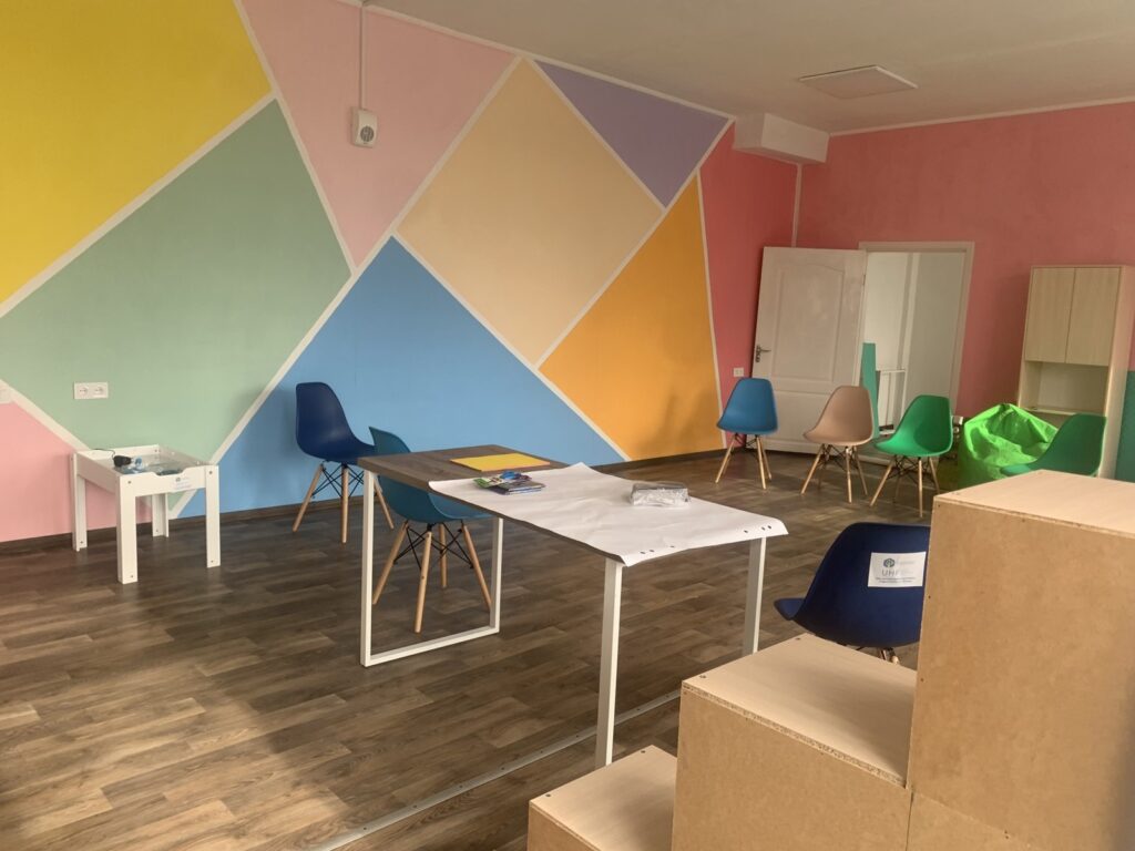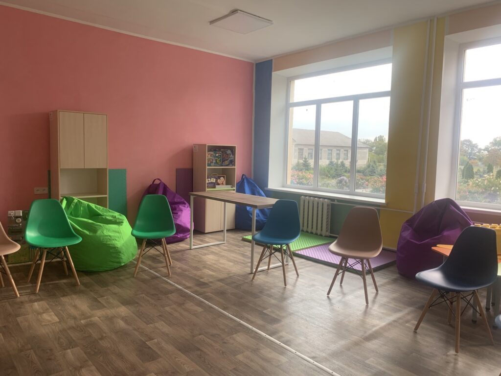 Велика світла кімната, стіни пофарбовані в приємні для зору кольори, на підлозі – новий лінолеум, зручні меблі… На шафах – книжки, ігри для розвитку, вʼязані мʼякі іграшки. На підлозі – приємний на дотик килимок. А ще – великі мати-татами, які можна викласти у будь-якій конфігурації. Столи, які зручно пересувати по кімнаті і ставити так у потрібному місці. Великі комфортні  крісла-груші для відпочинку. А ще – зона для молодших діток: маленькі стільчики, столи. Столи теж можна поставити по-різному.