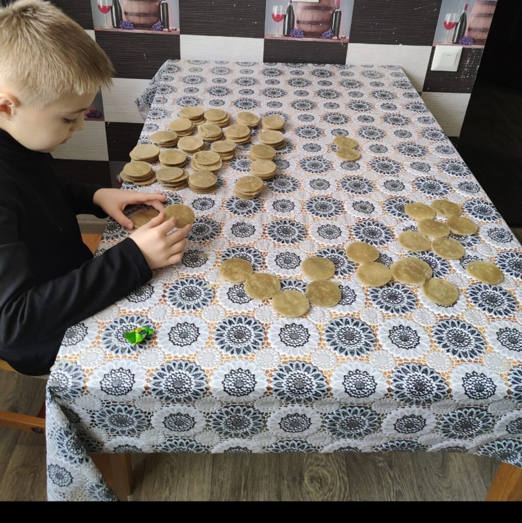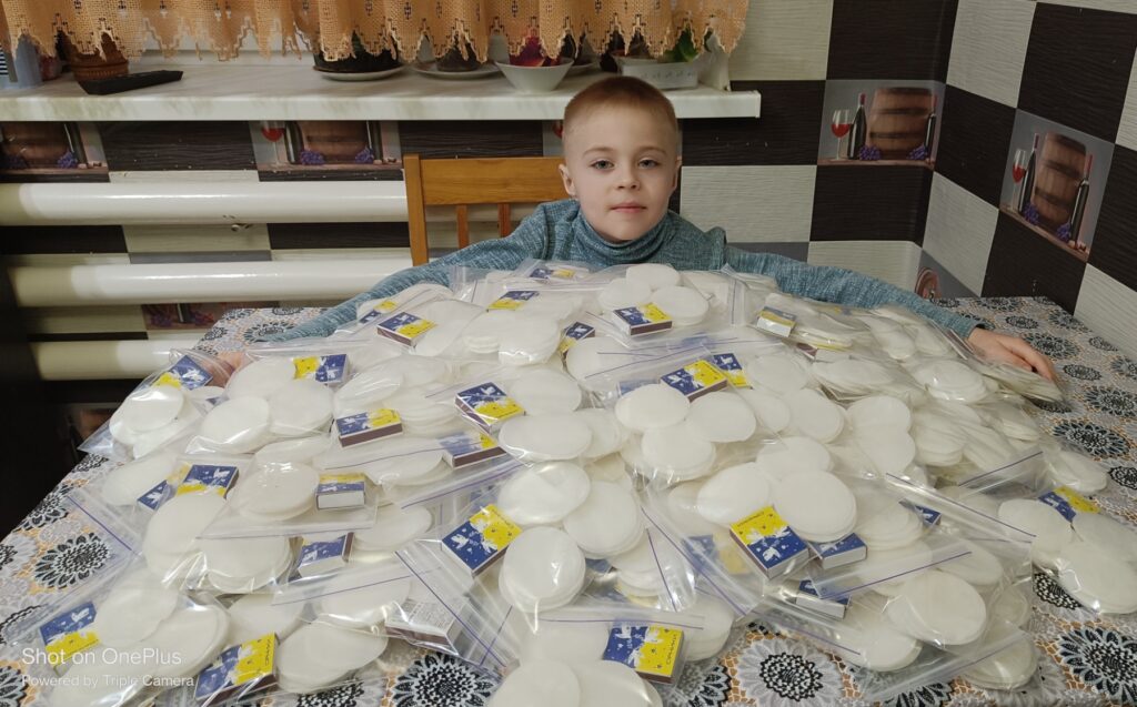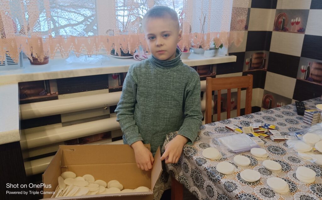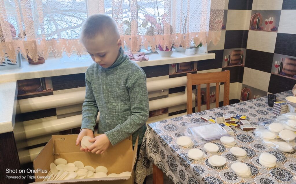 Задіяна вся наша родина. Чоловік занурює диски у парафін та викладає їх вистигати. Після охолодження Максим допомагає розпалювачі пакувати. Синочок неодноразово допомагав власними коштами зі своєї скарбнички, щоб придбати необхідні матеріали – ватні диски та парафін. Зазвичай ці кошти він збирає на свята та на своє день народження. Крім того, Максим постійно донатить на ЗСУ власно зібраними коштами. Перший його донат був 600 грн! Це був збір, який оголошували по телевізору на допомогу ЗСУ.