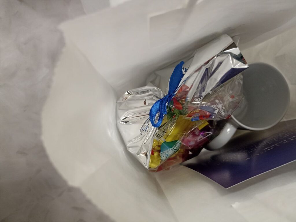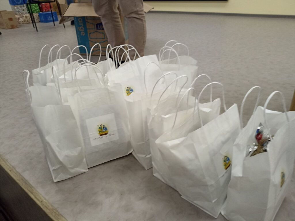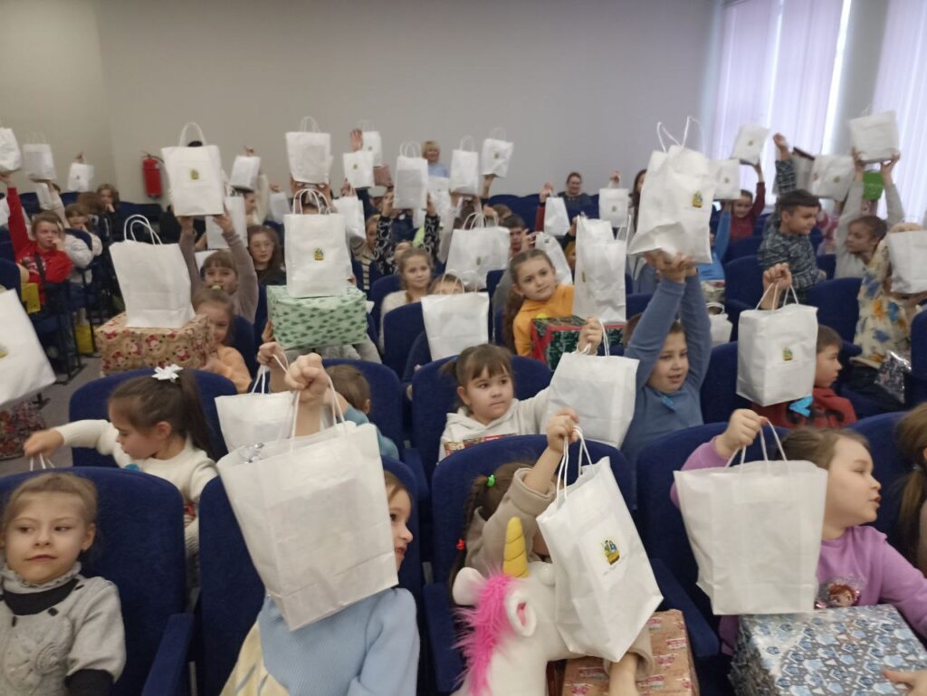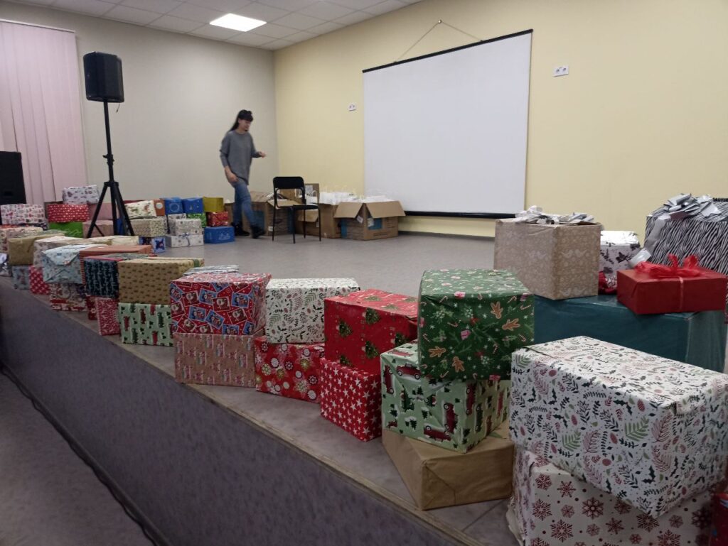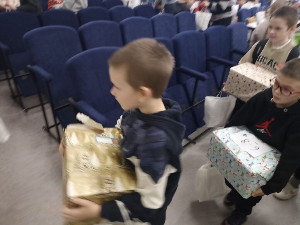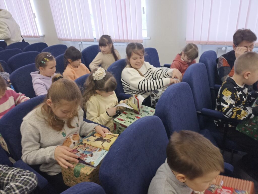 А далі настав чарівний, довгоочікуваний час вручення подарунків. Їх принесли кожній дитині до місця сидіння: здорові коробки, а також біленькі пакетики з новорічними солодкими подарунками в них. Кожній дитині подарували дитячу Біблію (в коміксах).