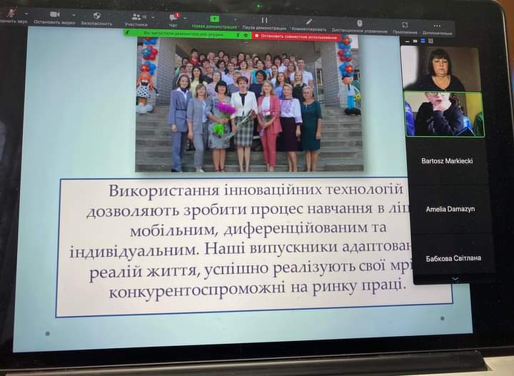 Онлайн-зустріч відбулася у рамках українсько-польського проєкту «Сватка». Учні ліцею №2 підготували польською мовою розповідь про себе та свої уподобання. Показали відео про свій чудовий навчальний заклад. Відповідно й польські друзі англійською мовою розповіли про свою школу.