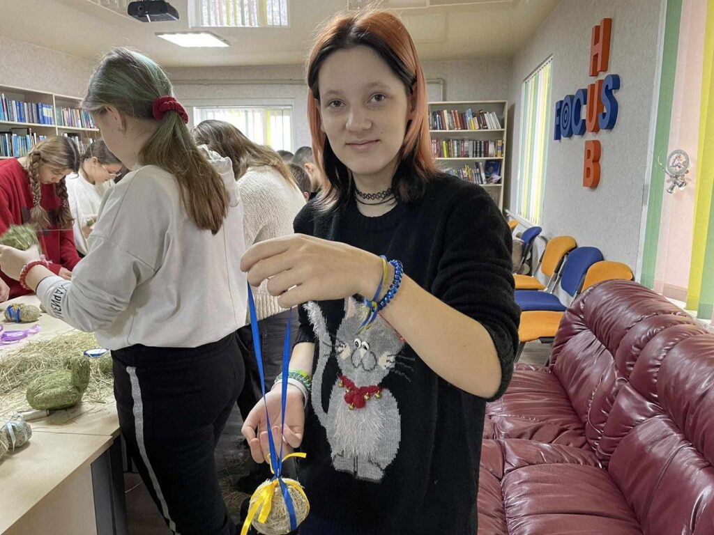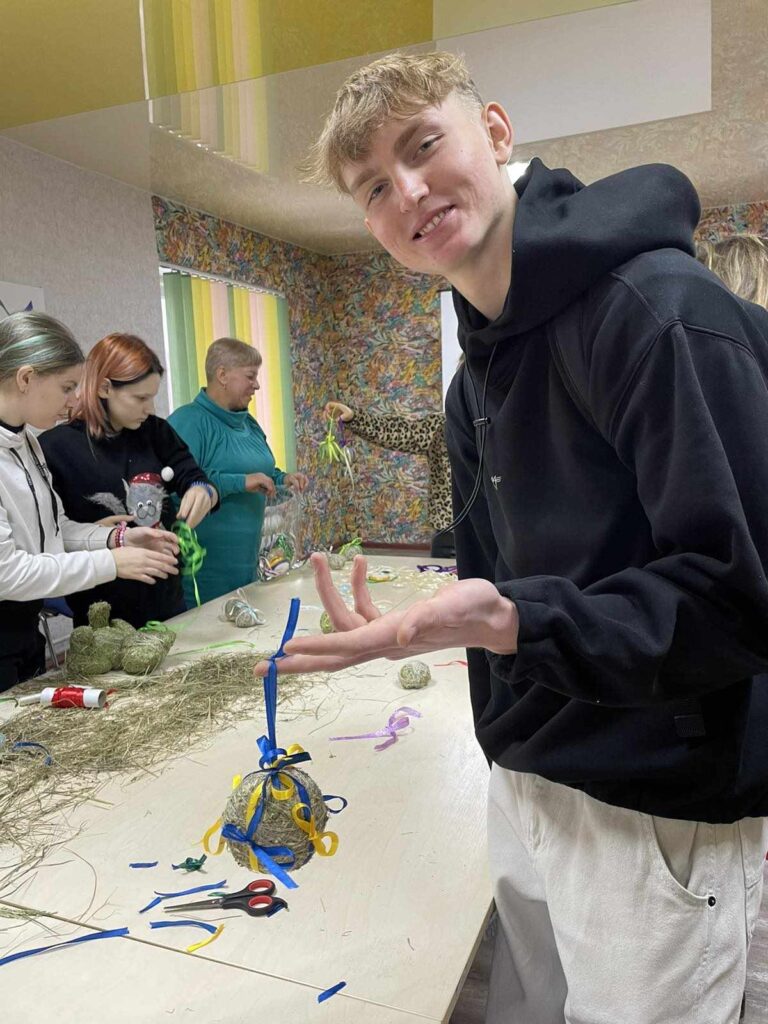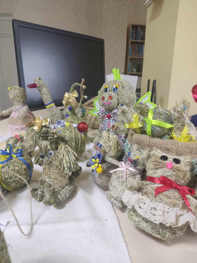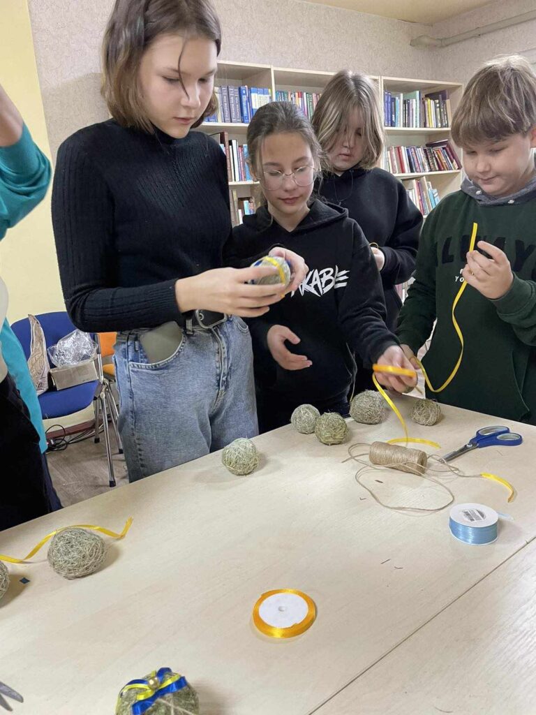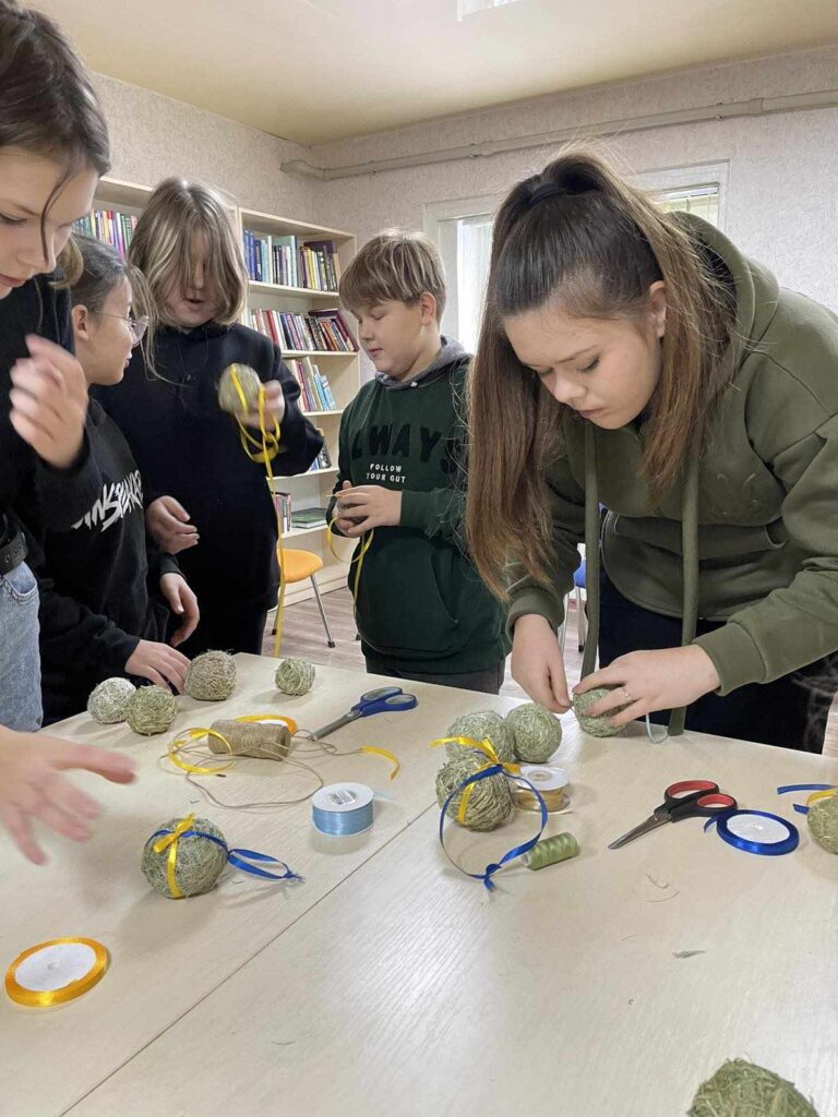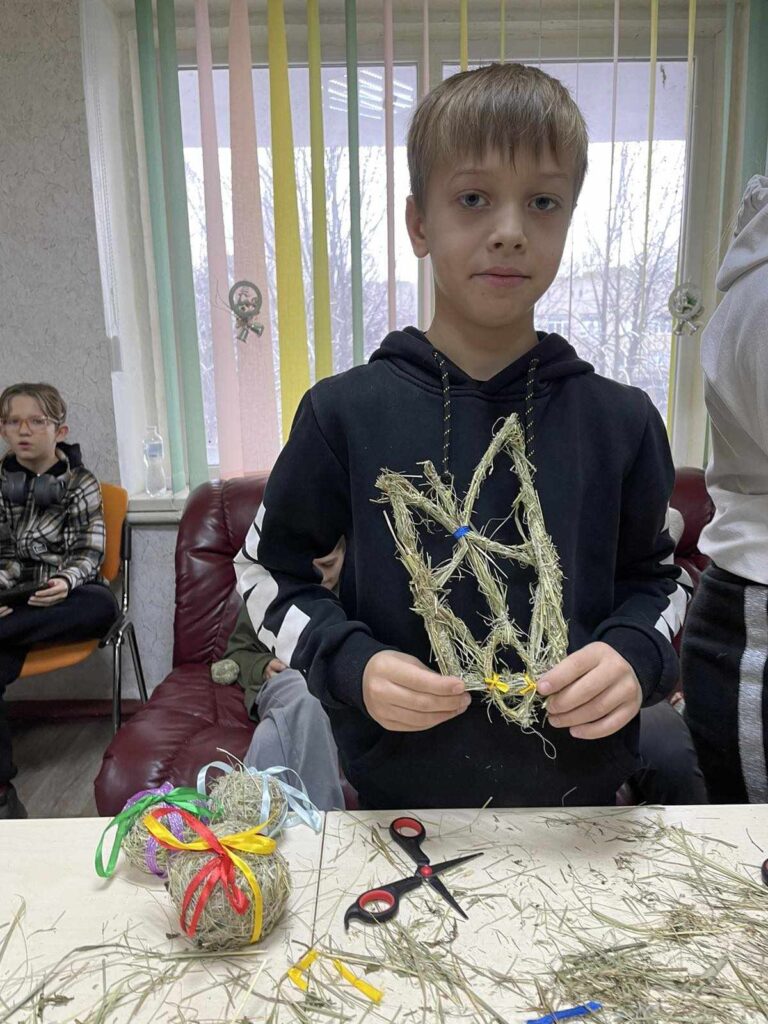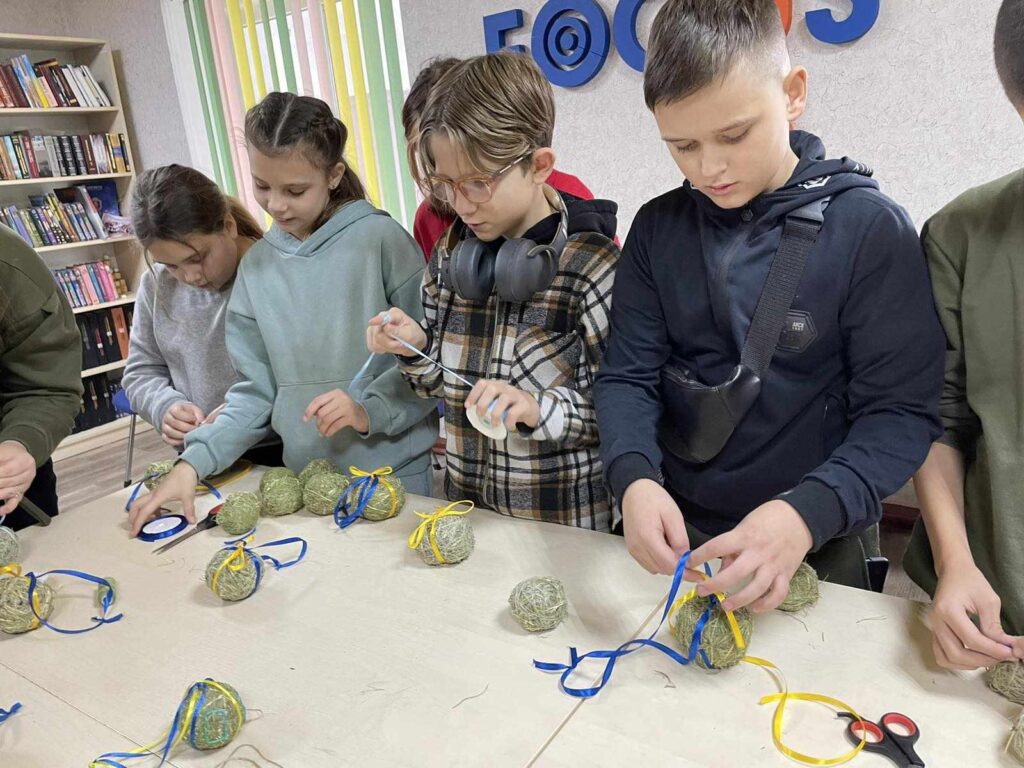 Із задоволенням діти долучилися до такої цікавої роботи. Уважно слухали пояснення майстрині, старанно виконували завдання. І в руках оживало сіно! Особливо надихалися думкою, що виготовляли ялинкові прикраси для захисників та захисниць. Трепетно прикрашали свій виріб жовто-блакитними та кольоровими стрічками.