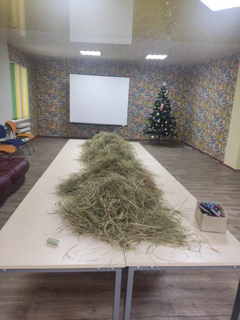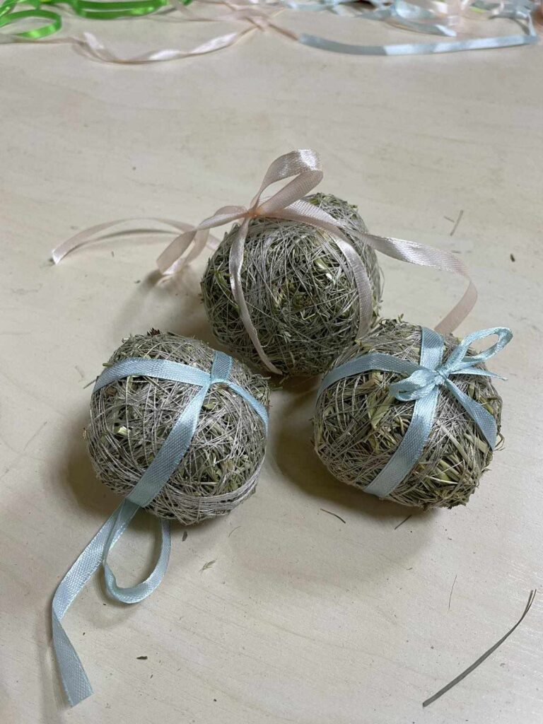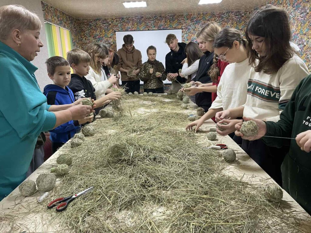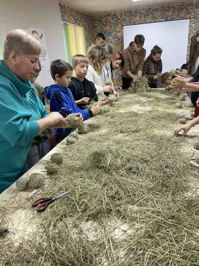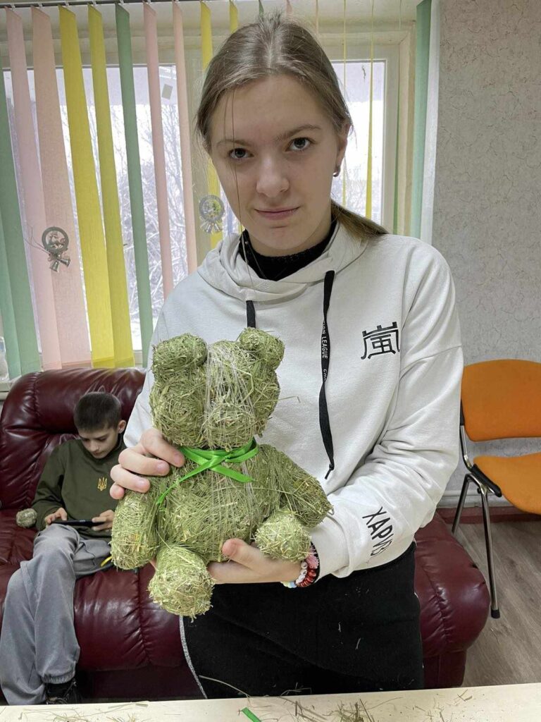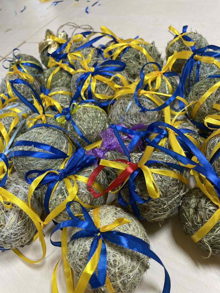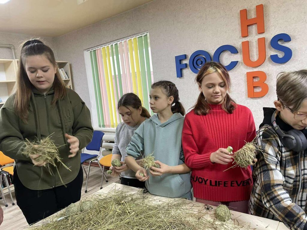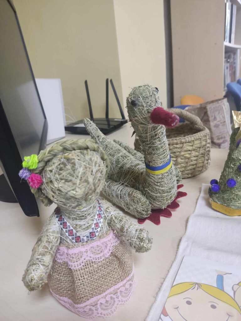 Із задоволенням діти долучилися до такої цікавої роботи. Уважно слухали пояснення майстрині, старанно виконували завдання. І в руках оживало сіно! Особливо надихалися думкою, що виготовляли ялинкові прикраси для захисників та захисниць. Трепетно прикрашали свій виріб жовто-блакитними та кольоровими стрічками.